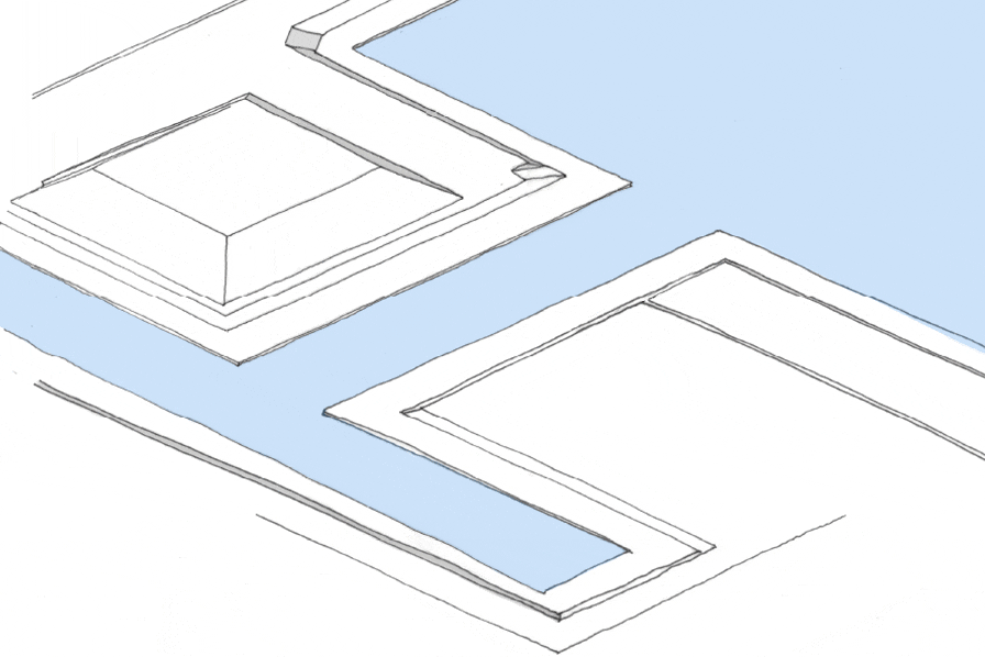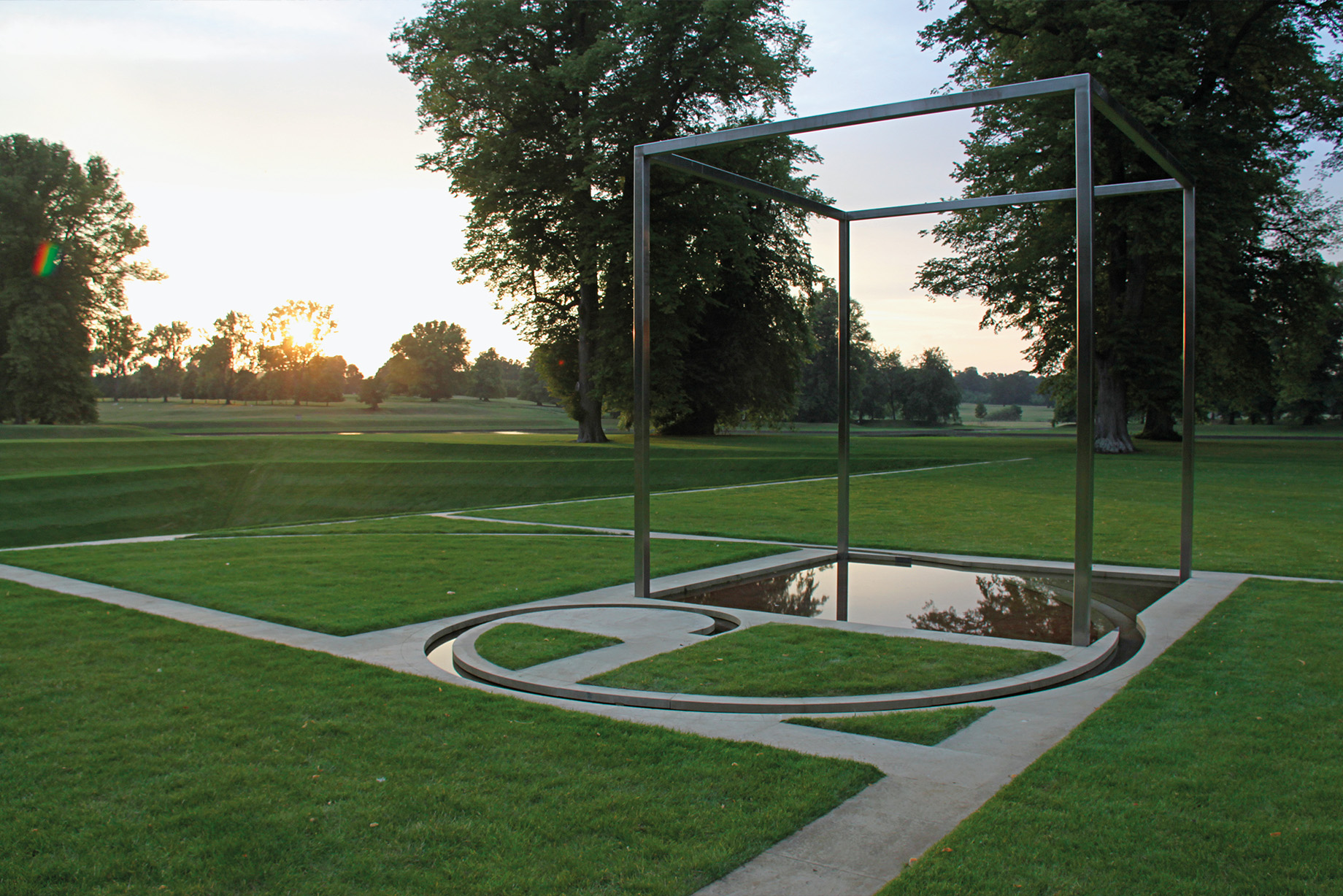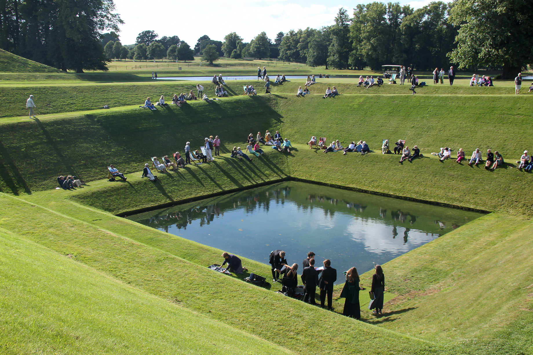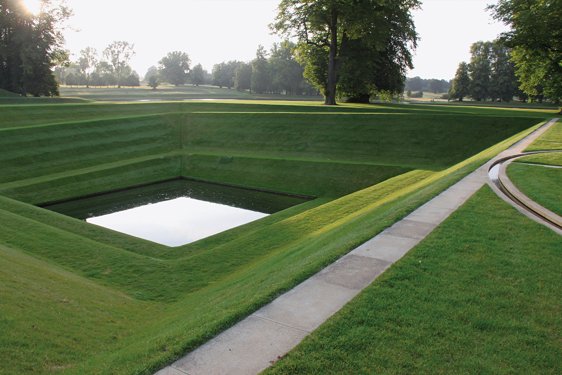 The inverted grass pyramid descends 7 metres below the level of the restored terraces. Walking around the landscape, the new design is invisible, but drawing near to the mount, a gentle grass path spirals down to a square pool of still water deep underground. The water reflects the sky, a little like an inverted James Turrell occulus.