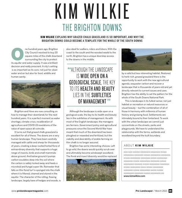 Brighton has some interesting choices. Left to go wild, the Downs would quickly scrub over and ultimately become windswept woodland. The floral and insect diversity would be replaced by a valid but less interesting habitat. Restored to herb-rich, grazed grassland there is the opportunity to work with the new agricultural agenda, sequester carbon and recover a landscape that is thousands of years old and yet directly relevant to current issues and uses.